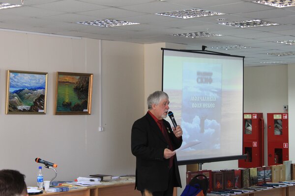 На встрече с читателями библиотеки 20 февраля Владимир Скиф рассказал о своей книге «Молчаливая воля небес», о планах на будущее, о работе XIV съезда Союза писателей России, где он выступал с докладом как председатель Иркутского регионального отделения Союза писателей России. И конечно же поделился своими впечатлениями о премии: